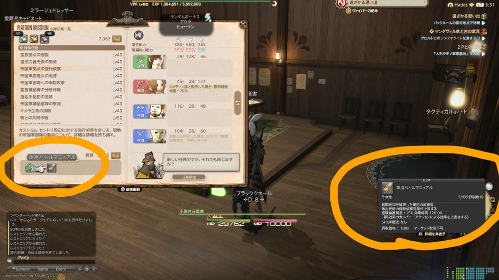 更なる経験値UPで使える任務は「小隊ランク3」からが本番。(軍用バトルマニュアル重複によるもの)