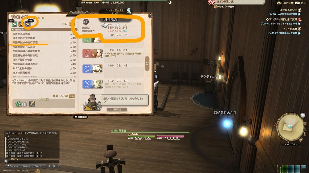 小隊任務で今受注したい任務の適正能力まで訓練を行い、現在のステータス能力を上げていきます。
